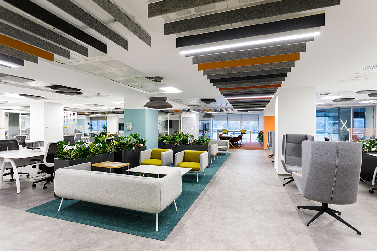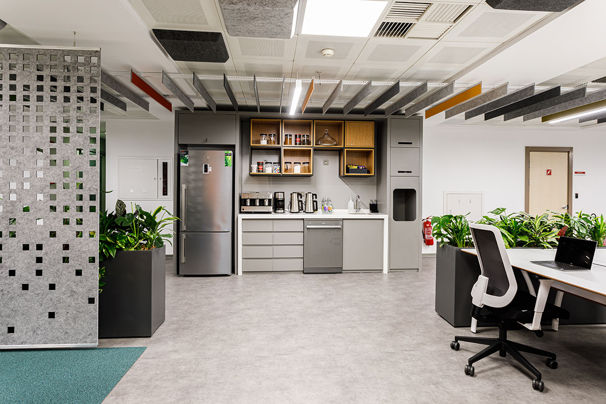 A vibrant atmosphere was achieved through the use ofdynamic wall colours, acoustic ceiling panels, accent carpeting, and soft furnishings. Existing workstation ports were repurposed with new tabletops to maintain sustainability and cost-efficiency, while open kitchenettes were retained and integrated into the updated design. The addition of greenery throughout the office further enhanced well-being and brought a sense of nature into the workspace.