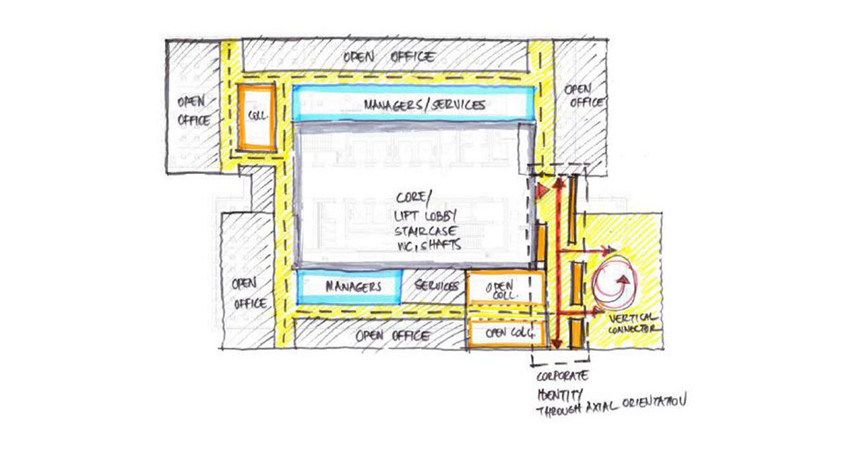 The floorplan is strategically organized to support functionality and efficiency. Open-plan work areas are positioned along the perimeter to optimize access to natural light, while service and support functions are arranged around the concrete core. This layout ensures a balanced and productive working environment tailored to Eurocross’soperational needs.