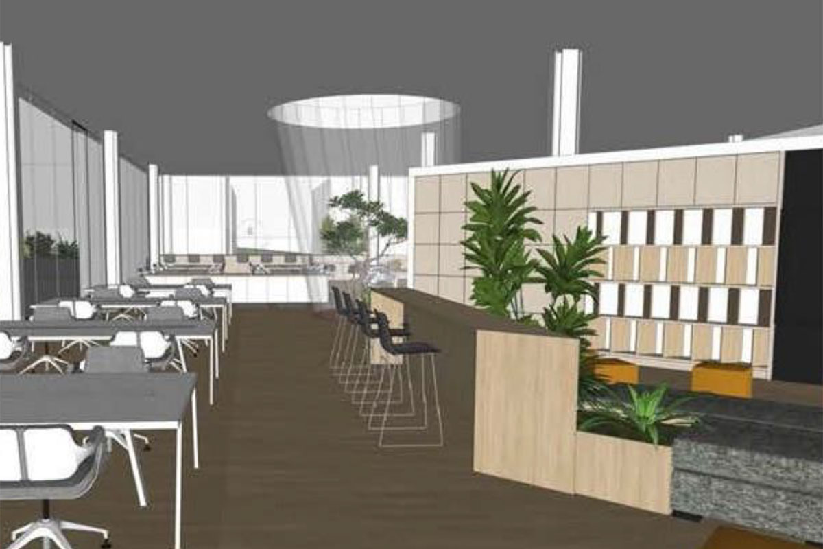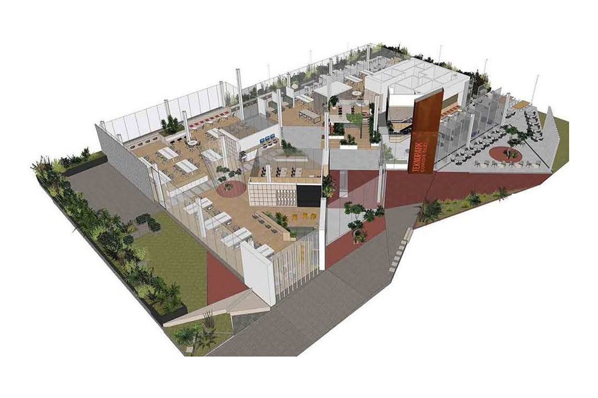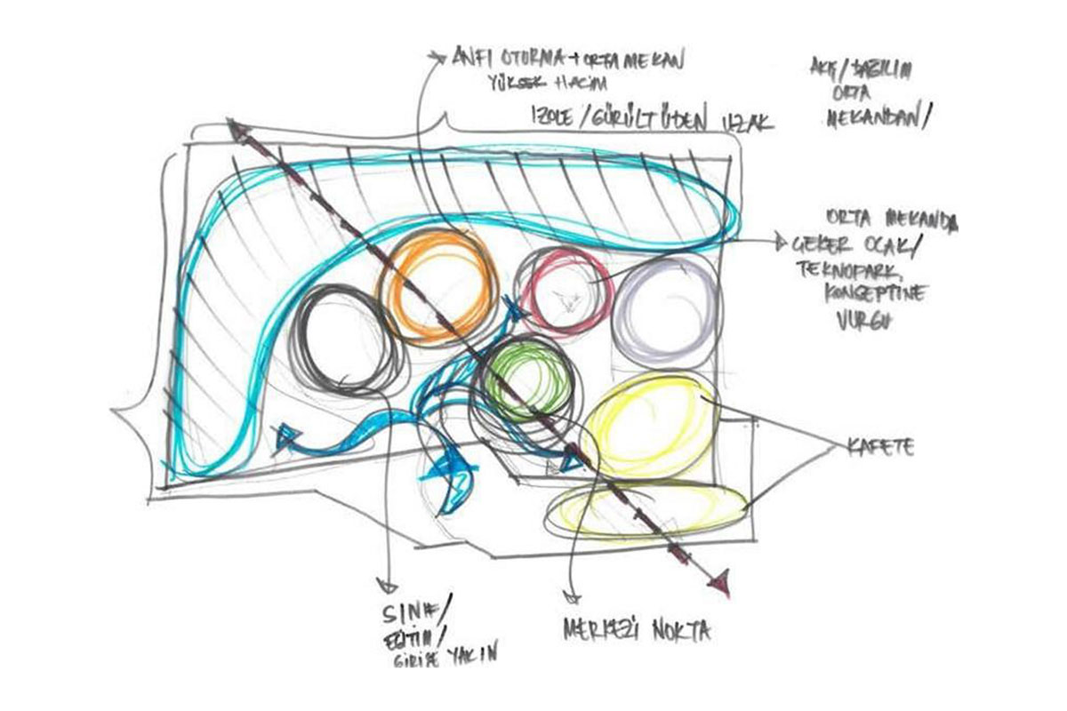 Designed as a 24-hour collaborative workspace within the Technopark campus, the Co-Working Hub is positioned above a parking garage, with expansive views of the lake. The project aims to create a seamless spatial dialogue between the lake, the upper square, and the promenade through a transparent and fluid interior layout.