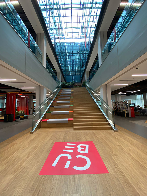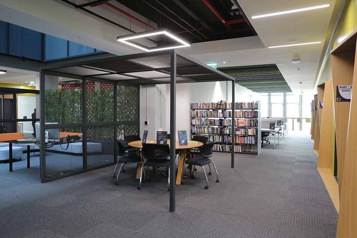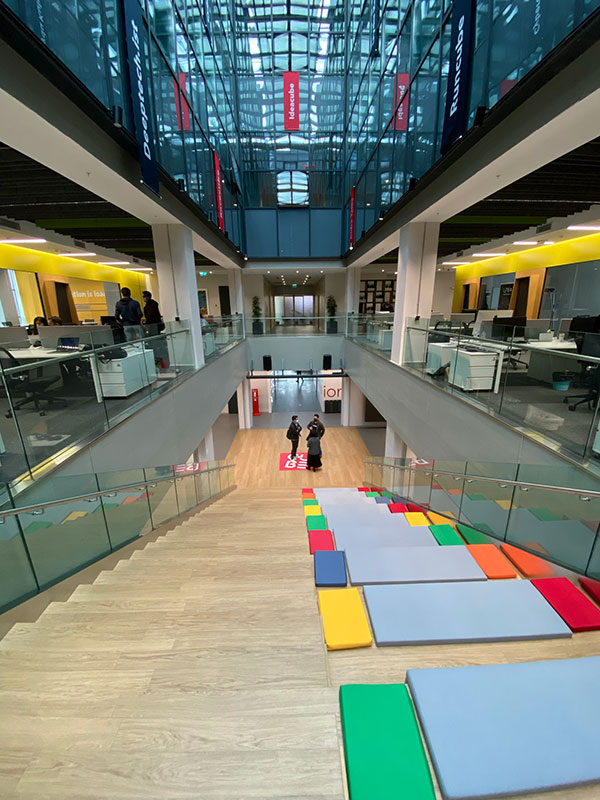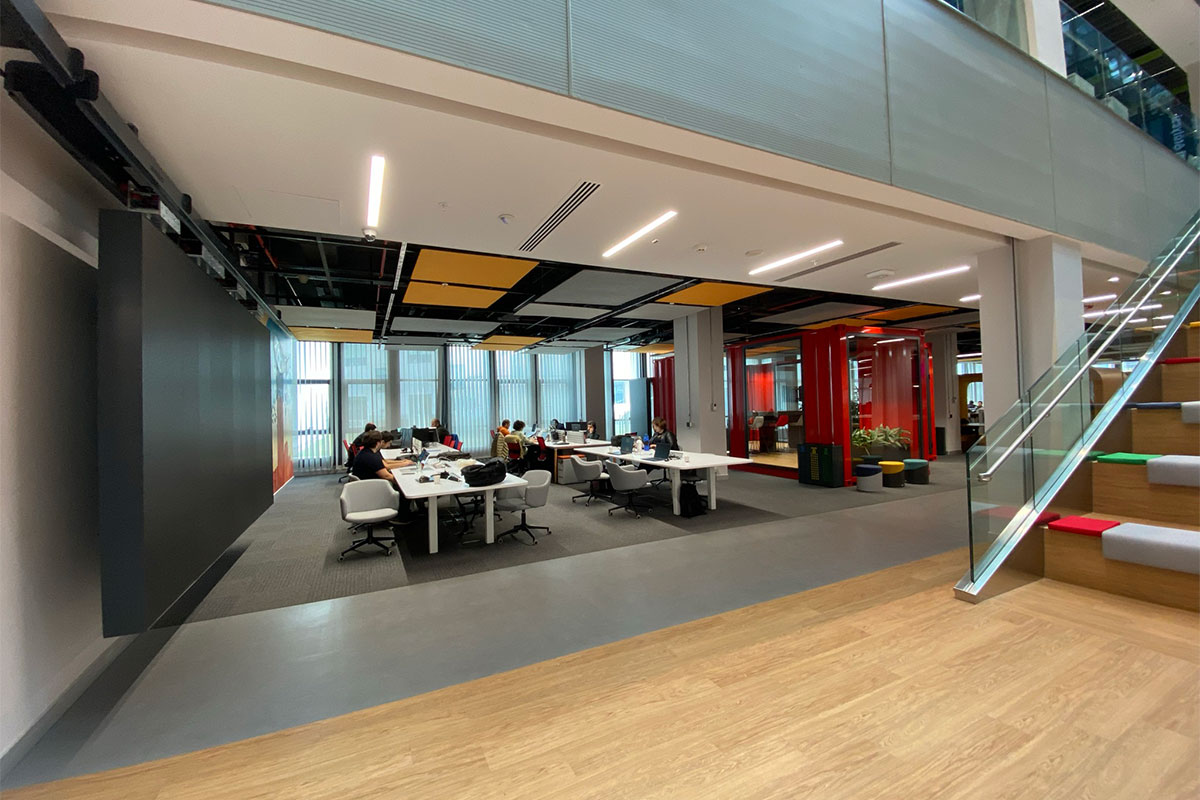 The upper floors feature a blend of open-plan and enclosed environments tailored to support start-up enterprises within the Technopark network. Each floor is defined by a unique colourtheme, aiding wayfinding and reinforcing the organizational structure of the space.